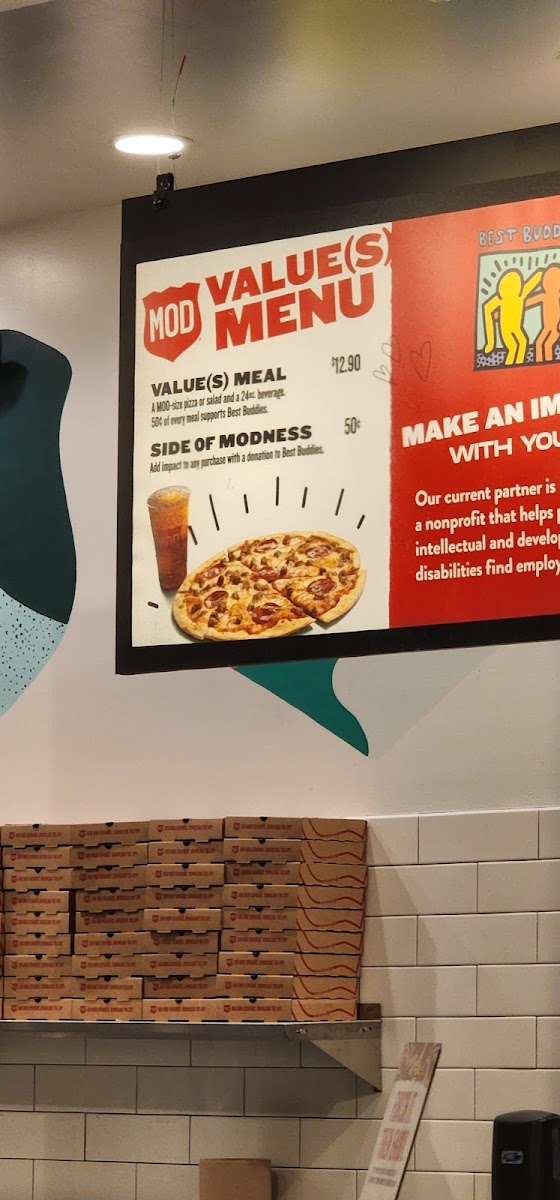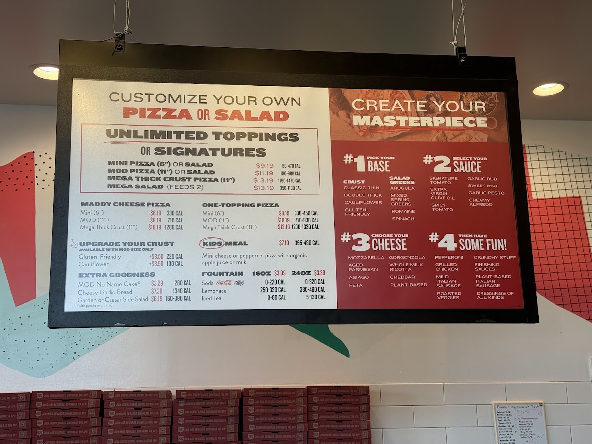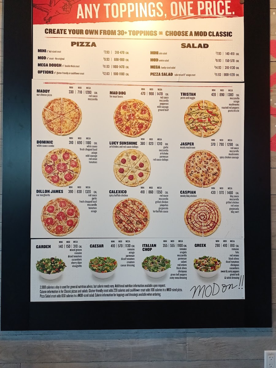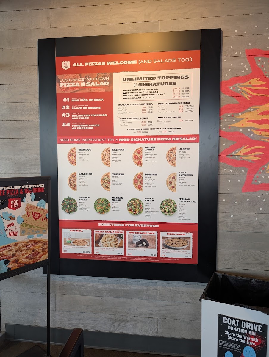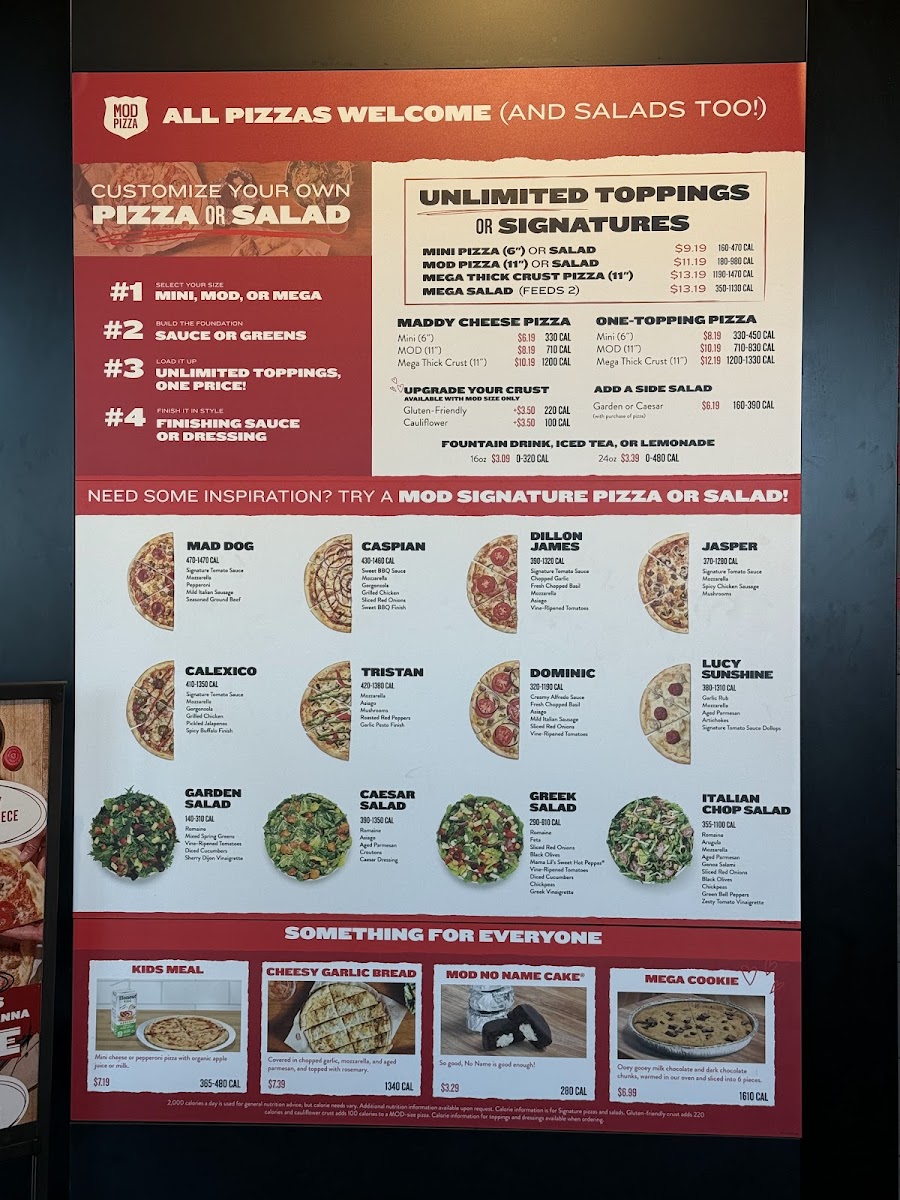 The menu at Mod Pizza in Buckeye, AZ offers a variety of delicious options for all tastes. Their pizza selection includes classics like the Cheese (The Maddy), along with specialty pies such as Dillon James and Lucy Sunshine. You can also customize your pizza with a One Topping or go all out with Unlimited Toppings for an extra layer of flavor. For sides, there’s Cheesy Garlic Bread and a fresh Side Caesar or Side Garden salad to complement your meal. The salad choices include refreshing options like the Italian Chop, GreekGarden, and the simple but satisfying Caesar salad. Desserts such as the indulgent Mega Cookie and the Chocolate Peppermint Cookies (Pack of 4) offer a sweet finish to your meal, while the No Name Cake and Red Velvet No Name Cake are perfect for dessert lovers. The restaurant also caters to kids with their Kids Meal, providing a smaller, fun option for younger diners. To wash it all down, the beverage menu features refreshing choices like Coke Classic (20 Oz Bottle), Boylan's Creme Soda (12 Oz Bottle), and Mexican Coke (12 Oz Bottle). Additionally, various extras like Wrapped Fork, Parmesan Cheese Packet, and Red Pepper Flakes Packet are available for enhancing the meal.